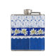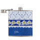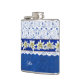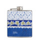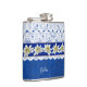 Pretty drinking flask done in a blue on blue damask pattern, with graphics of a white lace overly, on the top half of the flask. Graphics of a blue satin looking ribbon, with white edelweiss flowers, runs across the middle. Personalise the white text, on the front, for yourself or as a charming gift idea.