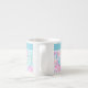 A very pretty little Espresso Coffee Mug, with a pattern of pink roses on a sky blue background, dotted with white butterflies: from a handpainted watercolour design by Judy Adamson. You can add text to the plain band at the top or just leave it plain.