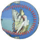 This custom softball has a pretty fairy with red hair and monarch butterfly wings wearing a golden dress on a blue background. Customise your text with the template.