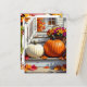 A lovely personalised Thanksgiving postcard full of colourful vibrant Fall leaves and pumpkins sitting o a farm house front steps. You can customise your Thanksgiving message on the back in the personalise area.
