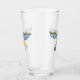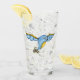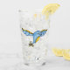 This glass tumbler for beverages has a pretty fantasy bluebird in flight with a yellow scrolled tail and dark blue dotted accents.