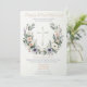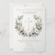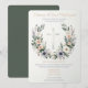 This invitation card exudes the serenity and grace of the Easter season, with a tasteful and delicate floral wreath encircling a central white cross. The wreath features soft hues of lavender, blush, and cream flowers, interspersed with lush green leaves and sprigs, all set against a clean, white background. The design is symmetrical and balanced, with the cross at the heart of the composition, symbolising the spiritual significance of the occasion. The overall aesthetic is one of peaceful celebration and refined elegance, inviting attendees into a contemplative and joyous observance of Easter.