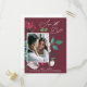 This beautiful wedding save the date one photo postcard features elegant calligraphy script and a watercolor boho floral and greenery bouquet on a burgundy red background.