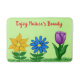 Pretty flowers in the garden green grass with golden yellow flower, blue flower and purple tulip with green leaves. With the wording, Enjoy Nature's Beauty in red script. Shown on a refreshing light green background. Fun and cheery bathroom bath mat to use during the spring and summer months. Leave wording or personalise it or delete text. Lovely for anyone who loves nature and the outdoors. Original Hand-Painted Graphic Artwork by TamiraZDesigns.