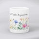 Beautiful watercolor flowers border this mug. For seasonal home decor, mugs are an easy change from cosy winter to a colourful spring aesthetic. Text can be changed. AI assisted graphic purchased with commercial license. Artwork: MokoDE