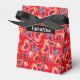 Favour Box featuring hand dawn and digitally designed, colourful, foil textured, red, orange, pink, purple stack, double heart lollipops pattern on a red background.