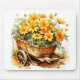 This unique mousepad features an illustration of some flowers in a wooden cart.