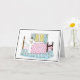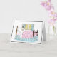 Cheery, cut get well card. Very girly pink bedspread and blue ruffle and curtains, with girl in a night cap resting in bed.