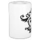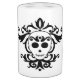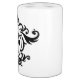 A beautiful toothbrush holder and dispenser set with a picture of an elegant skull and black damask on it.