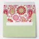 Stylish light green invitation envelope, with graphics of a pink, green, white and red paisley pattern, on the inside. Personalise the black return address, on the back flap. Great as a finishing touch to our Pretty Paisley Wedding Rehearsal Dinner invitations and matching RSVP cards.