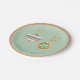 Christmas party paper plates done in pale green, with graphics of gold accents and two pretty Christmas tree ornaments. Green custom text is ready to personalise to suit your party needs.