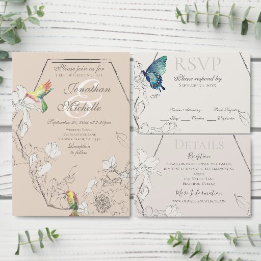 This geometric floral bridal shower invitation features two beautiful hummingbirds. They are perched on an elegant flower arrangement that is beautifully intertwined with a dark grey artful hexagon. This invitation is done in shades of peach, grey and beige.