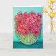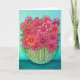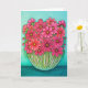 A stylised, vibrant floral painting of cosmos in many shades of pink in a glass vase on a turquoise background on a greeting card by Lisa Lorenz