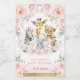 This dreamy design features illustration of a collection of adorable jungle animals surrounded by gorgeous blush pink flowers and delicate watercolor greenery