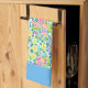 A very pretty Kitchen Towel or Tea Towel, with a pattern of pink, yellow and blue primroses, from a handpainted watercolour design by Judy Adamson. This towel's border is in Sky Blue but other colours are available.