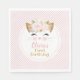 Cute pink and gold birthday party napkin for kitty lovers! A kitten face with a floral crown adorns the centre. Easy to personalise with name and event.