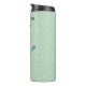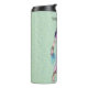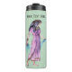 This thermal tumbler bottle to keep your drinks cold or hot is green with blue accents with a pretty lady from ancient Egypt in a long pink dress wearing gold jewellery and a blue scarf. Customise your text with template.