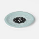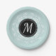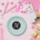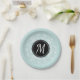 Romantic paper plates with mint blue floral wreath and personalised monogram.