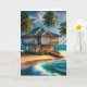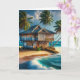 Happy Anniversary card. Pretty ai art with a big log cabin beach house on the ocean watercolor style with palm trees blowing in the breeze.