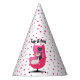 This paper party hat is white with vibrant pink polka dots and two pretty cats, one black black and one white in mid century style siting in a pink chair. Customise the Happy Birthday text with the template.
