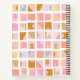 A cute and fun design of little squares with a variety of geometric shapes in pretty pastel colours of pink, coral, and yellow paired with a golden shade of amber.