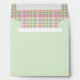 Pretty pale green coloured square invitation envelope with a pastel pink, green, and yellow plaid pattern lining the inside. Dark grey custom return address is ready to personalise, on the back flap. Lovely finishing touch to our Plaid Couple's baby shower invitation.