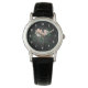 An elegant watch with an image of some pretty pastel pink flowers with green swirly stems and leaves on a black background. Glowing light surrounds the flowers which accentuates and illuminates.