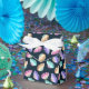Favour box with a beautiful pattern. Watercolor butterflies, painted in pastel colours including pink, purple, blue, yellow and green. Dark blue watercolor background.