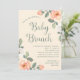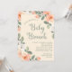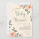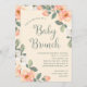 This lovely baby shower brunch invitation features a soft peach background with subtle white polka dots, and trendy peach and white flowers with lots of green leaves.