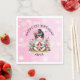 Cute little Asian girl sitting in pink flowers holding a doll personalised birthday party paper napkins..