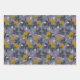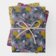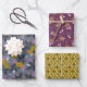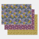 Coordinating party wrapping paper with various floral motifs in rich gold, warm wine, poppy pink, and deep grey blues.