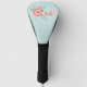 Pretty lady's driver golf club cover done in a robin's egg blue with a tiny polka dot pattern. Graphics of a coral pink flower decoration and banner, decorates the middle of the cover. Personalise the black text, on the banner, to suit your needs. Great gift idea. Chose either driver cover or putter cover.