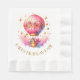 Pink and gold personalised birthday party paper napkins with a pretty hot air balloon and basket full of gifts.