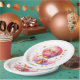 Pink and gold personalised birthday party paper plates with a pretty hot air balloon and basket full of gifts.