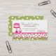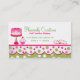 Pretty bakery business card done with graphic artwork of a whimsical pink, green, and white polka dot scalloped edge, on the bottom of the card. Graphics of a cake on a whimsical cake stand, a lone cupcake, and iced cookies decorate this adorable bakery business card. Text in pink and green is fully customisable to suit your business needs. Personalise the text for your bakery business. Great for at home bakers too.