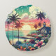 Beach themed throw pillow. Pretty turquoise, teal and pink ocean view with a sunset and silhouettes of palm trees, beautiful tropical flowers and a pier and beach house.
