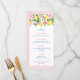 A pretty pink and white menu card design with watercolor lemons and pink flowers. Shown here for a bridal shower but would also work well for a baby shower to welcome a little girl or a birthday party.