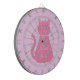 This awesome dart board features a digital art image of a pretty pink cat with a curly tail. Her eyes are pale pink with black pupils and she has long black eyelashes. She is wearing a pink bow in her hair and a beautiful pearl necklace around her neck.