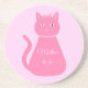 This awesome sandstone coaster features a digital art image of a pretty pink cat with a curly tail. Her eyes are pale pink with black pupils and she has long black eyelashes. She is wearing a pink bow in her hair and a beautiful pearl necklace around her neck.