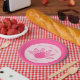 This awesome set of Baby Shower paper party plates features a digital art image of a pretty pink Baby girl Thanksgiving Turkey. The Turkey has a bright pink body with pink tail feathers sticking up. It has pale pink legs and beak and pretty pale pink eyelids.