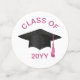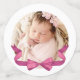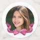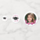 Girly graduation table confetti for the graduation party with two photos of the graduate adorned with a printed pretty ribbon with a bow in a fuchsia rose shade of pink. Add the year on a confetti with a graduation cap with a pink tassel. The future is bright in a script with a pink bow above.