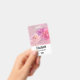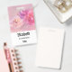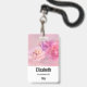 Personalised name badge with a photograph featuring a bouquet of pink carnations. Set on a dreamy ethereal background.