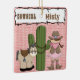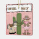 Adorable little cowgirl wearing a pink dress with a leather vest over it, a pink neckerchief, cowgirl boots with pink trim and a cowgirl hat with pink trim and a star on the front. She's standing next to a cactus with her pony tied to it. At the top it says Cowgirl and then you personalize with her name, which is then surrounded by a barbed wire fence. On the reverse side it has just her pony tied to a hitchin' post. Both sides have a pink and white polka dot background. Fun gift for your little girl!