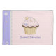 Pretty pink and white striped girl's pillow case, with lovely graphics of a pink iced cupcake, in the middle.  Graphics of white lace decorates a periwinkle blue hem area.  Periwinkle blue text reads Sweet Dreams, and can be personalised to read what you want.