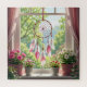 A gorgeous puzzle with an ai illustration of a beautiful pink feathered dreamcatcher hanging in the window with a shelf of pink and white potted flowers under it, overlooking a yard full of Lucius green trees.