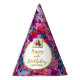 Fun, festive party hat featuring your photo and custom text encircled by a chic faux gold ring and set against a pretty pink, purple and blue floral pattern. Perfect for a birthday party, bridal or baby shower, retirement party, graduation and more.