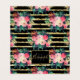 A girly boho chic watercolor hand paint garden floral design, elegant teal green foliage botanical artwork, and gold brush paint strokes stripes, filled with blush, peach pink, bubblegum pink, yellow, red, orange and white color flowers, dreamy romantic spring floral and flower buttons design, on a black and gold lines color trend background. This whimsical, chic, feminine, vintage feel, botanic original pattern is perfect for everyday wear, home decor, celebrations and special days theme decorations.