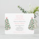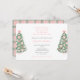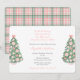 This baby girl baby shower invitation design features watercolor Christmas trees adorned with pink and white "ginger jar" style baubles as well as white poinsettia and pink bows. Watercolor elements originally handpainted by me. The reverse side features a pink and green tartan plaid.