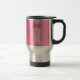 A chic and feminine vintage medallion pink damask pattern travel mug with a stylish and girly ribbon banner and a cute decorative double bow. Personalise this pretty pink old fashion style fashion accessory by adding your name to the custom text area. Flat printed image, not actual ribbon. Design copyright of @OhSoGirly