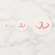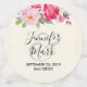 Personalised wedding confetti to sprinkle on a table. Designed with a pink rose and peony flower border. Cheerful and summery. Background is a faux parchment image. The backsides have pairs of joined hearts in pink and red.